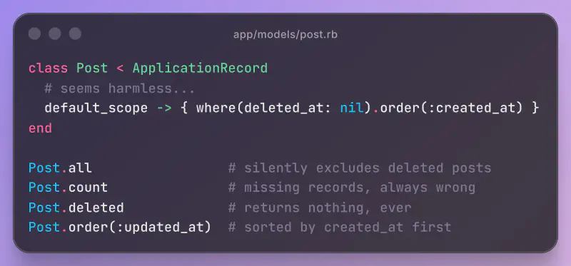 `default_scope` quietly breaks `Model.all`, corrupts scope chaining, bleeds into associations, and can leak data in multi-tenant apps. Here's why it's dangerous and what to use instead.